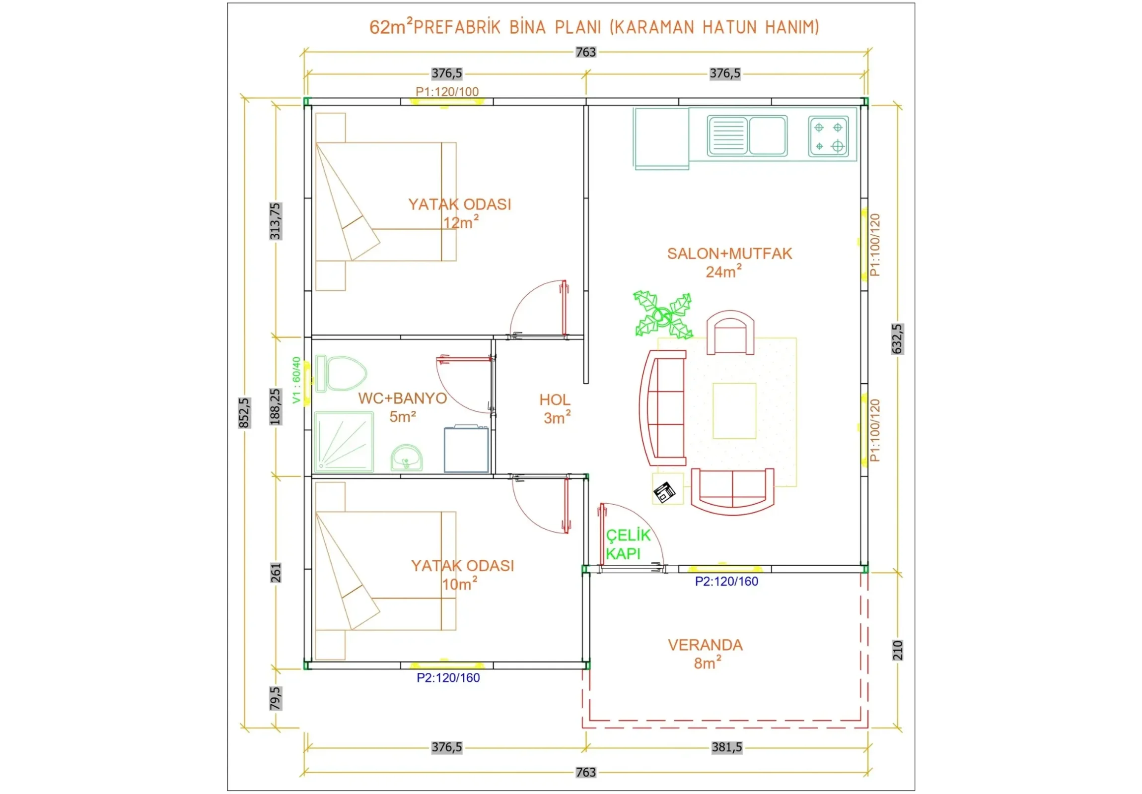 Plan: Ön üretimli prefabrike yapılar, genişlik ve uzunlukları 125 cm’nin katları olacak şekilde uygulanır. Bu yapılar, dört farklı panelin modülasyonundan meydana gelir: dolu duvar paneli, pencereli duvar paneli, vasistaslı duvar paneli ve kapılı duvar paneli. En ağır parça dış kapılı paneldir (90 kg). Tüm mimari çizim ve hesaplamalar, teknik personel tarafından Autocad ve SAP 2000 programları kullanılarak yapılır.